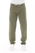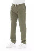 Elevate your style with Baldinini Trend’s precisely tailored chino trousers. Designed for the modern man, these pants feature a sharp front zipper and button closure, complemented by sleek side pockets and refined back welt pockets. Fashioned from premium 100% cotton for unmatched comfort and durability, each pair promises to enhance your ensemble with its chic army color. These trousers are a testament to Baldinini’s commitment to luxury and style perfection.
