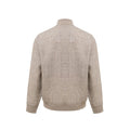 In beige linen, brown button closure, two front pockets with buttons, knitted turtleneck collar and elasticated waistband.