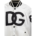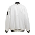 striped collar and trim, long sleeves with number applique on the upper left arm and circular brand crest on the upper right,