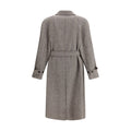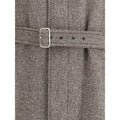 The Coat by Ferragamo is crafted from a refined herringbone-patterned fabric, showcasing timeless sophistication. It features a button-front closure and two front welt pockets. The structured collar includes an additional internal fastening with a concealed strap and buttons, offering both a tailored look and extra protection from the wind. Finished with a matching belt to define the waist, this piece reflects Ferragamo’s signature balance of craftsmanship, elegance, and contemporary design.