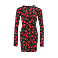 Dolce & Gabbana Cherry Print Stretch Fabric Mini Dress. Short, stretch fabric, allover red cherry print, long sleeves with covered zips, round neckline, and back opening with covered zip.