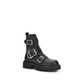 Vivienne Westwood’s Empire Ankle Boots reinterpret military style with a bold and provocative aesthetic. Made of waxed leather with a glossy finish, they feature buckled straps inspired by the world of bondage and fetish, distinctive elements of the Maison’s design language. The ankle-length model is complemented by a rounded toe, slip-on sole, tone-on-tone stitching and mixed-metal details for a bold look with a strong visual impact.