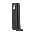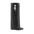 Givenchy leather Shark Lock Boots with an almond toe and distinctive padlock detail applied to the side panel. The trouser-effect shaft gives a bold, contemporary look, while the wedge heel ensures momentum and comfort.