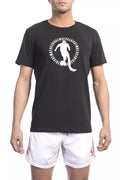 Elevate your casual ensemble with the distinctive flair of Bikkembergs. This sleek black T-shirt with a bold frontal print isn’t just a garment; it’s a statement. The signature logo proudly adorns the back for a touch of exclusive branding. Crafted from a sumptuous blend of cotton and elastane, it promises superb comfort and a flattering fit. Make an impact wherever you go with this Bikkembergs creation, designed for the man who dares to stand out.