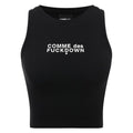 Infuse your wardrobe with the edgy appeal of ‘Comme Des Fuckdown.’ Captivating and daring, this cropped top in classic black is an emblem of urban chic. Crafted to turn heads, the ribbed cotton blend contours your silhouette while the bold rubber logo print stands as a declaration of your fearless fashion sense. Perfect for those who dare to stand out.