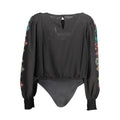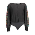 long-sleeved bodysuit, wide neckline, contrasting details, logo