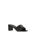 Miu Miu’s lambskin Sandals combine elegance and comfort in a sophisticated design. With a squared toe and padded straps, they are embellished with a metal plaque featuring the iconic Miu Miu monogram on the front. The geometric heel lends a bold, modern touch, while the branded insole adds an exclusive, classy detail.