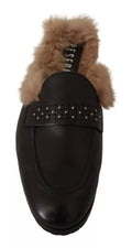 Black Leather Fur Perforated Slip On Flats Shoes