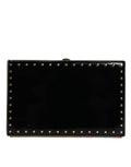 Black Leather Studs Gold Frame Clutch Evening Purse Bag