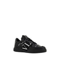 Calfskin VL7N Sneakers by Valentino Garavani, perforated round toe, flat sole, front lace-up closure, contrasting embroidered logo label on front tab, paneled design, webing bands with contrasting iconic brand monogram applied to side panels.