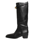 boots feature a sleek black finish with a signature logo plaque accent. Designed with an over-the-calf silhouette, they offer a striking statement style while providing a comfortable fit. Perfect for pairing with skirts, dresses, or slim trousers for an effortlessly chic ensemble.