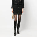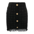 PINKO Girino mini skirt, black, basket weave fabric, lurex details, front button closure, high waist, fringed hem, thigh length, mixed composition with polyester predominance, hand wash.