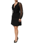Black Sheer Sleeve Belted V-Neck Mini Dress