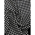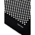 In black silk with a white polka dot print and a contrasting logo printed on the side.