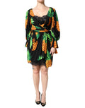 Gorgeous brand new, 100% Authentic Dolce & Gabbana wrapped dress. Featuring a sultry surplice neckline, this chic black dress is adorned with a vibrant pineapple print that’s perfect for making an impression. The long puff sleeves and ruffle tie cuffs add a romantic touch, while the side tie closure ensures a flattering fit.