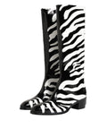 over-the-calf boots featuring a bold black-and-white zebra pattern. Designed for a fashion-forward edge, they offer a sleek, elongated silhouette that instantly elevates any outfit. Perfect for adding a touch of wild sophistication to both casual and evening ensembles.