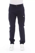 Elevate your wardrobe with the Baldinini Trend Cargo Trousers, where functionality meets Italian elegance. These trousers blend a solid blue hue with a structured fabric, tailored for the stylish modern man. Equipped with a smooth front zipper and button closure, they offer both convenience and sophistication. Boasting four side pockets and refined back welt pockets, they are the epitome of practical chic. Perfectly merging comfort with style, thanks to the Cotton and Elastane blend, they are designed to keep you at the forefront of fashion without compromising on comfort.