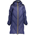 long goose down jacket with hood, zip, 2 external pockets, 2 internal pockets, contrasting details, application, logo