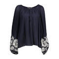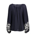 long sleeve blouse, wide neckline, 3 buttons, wide sleeves with elastic cuffs, embroidery, logo