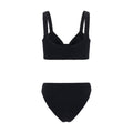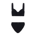 Bonnie Swimsuit by Hunza G, bandeau top piece with wide straps, smock stitch creates sweetheart neckline on front, high-waisted bottom, stretchy monochrome pattern.