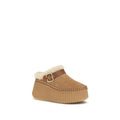 The Nama Wedge Mules by Chloé blend casual elegance with artisanal mastery. Crafted from suede calfskin and shearling, they feature a leather strap with the House’s signature Paddington buckle. The lightweight wedge, made from recycled materials, is enriched with hand-stitched saddle detailing, a testament to the meticulous craftsmanship behind the design.