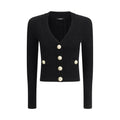 Cardigan by Balmain, cropped design, v-neck on front, closure by embossed buttons, close fit, monochrome pattern.