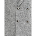 The Deconstructed Blazer by Brunello Cucinelli is crafted from wool and cashmere grisaille with a bouclé yarn, offering a slightly speckled effect and a soft, lightweight texture. The one-and-a-half breasted design is completed with patch pockets, metal buttons, and the signature “Spalla Solomeo” shoulder, which provides structure without padding, naturally enhancing the masculine silhouette.