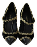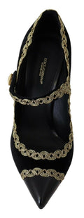 Gorgeous brand new with tags, 100% Authentic Dolce & Gabbana Classic mary jane pumps in plush black velvet patent with the label’s iconic gold embroidery along the uppers. Pointed toes. Gold-tone studded ankle straps. Stiletto heels.