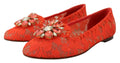 Gorgeous, brand new with tags 100% Authentic Dolce & Gabbana elegant Vally shoes are exquisitely crafted in Italy from the finest Taormina lace. Seen here in a rich coral red, these pretty floral lace Vally slippers from Dolce & Gabbana will instantly lift your look to new sartorial heights. Featuring an almond toe, a branded leather insole and a wearable flat leather sole, these beauties are finished with a sparkling decorative crystal flower on the front.