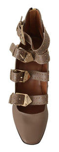 Brown Leather Block Heels Multi Buckle Pumps Shoes