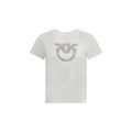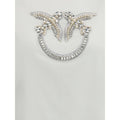 Pinko’s T-Shirt is distinguished by the embroidered logo on the front, enriched with rhinestones and pearls that give the garment a touch of brightness and elegance, perfect for a refined and feminine look.