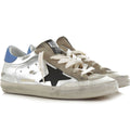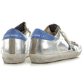 Golden Goose sneakers in silver patent calfskin, heel counter in smooth blue leather, star logo in black leather, front part and tongue in suede leather, inner part in leather and sponge, rubber sole with worn effect
