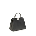 The Peekaboo ISeeU small Handbag by Fendi is crafted from brown Cuoio Romano leather with cappuccino-colored side panels, featuring a natural grain achieved through a metal-free tanning process.The leather-lined interior is divided into two compartments by a rigid partition and includes a flat pocket. Signature twist-lock closures on both sides, a silver Selleria plaque, and palladium-finish hardware complete the design.Equipped with a leather top handle and an adjustable strap, it can be carried by hand, over the shoulder, or cross-body.