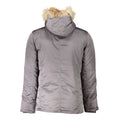 long sleeved jacket with hood, padded with real down, 2 pockets, 2 side pockets, 2 inside pockets, buttons and zip, logo
