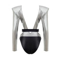 Dolce & Gabbana Silver Long Sleeve Swimsuit. In silver and black, long sleeves, padded shoulders, deep neckline, elasticated belt with removable logo.