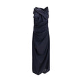 The Halter Galatea Dress by Vivienne Westwood shapes the figure with refined draping in semi-sheer wool, crafted with deliberately irregular seams for a unique asymmetric effect. The halter neckline cascades into folds that cinch at the waist, enhancing the silhouette and flowing into a column skirt. Sleeveless, with soft draping, a fitted waist, and an asymmetric hem, this dress is both elegant and contemporary.
