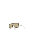 The Havana T-Bar sunglasses by Alexander McQueen feature a bold silhouette, with a warm-toned tortoiseshell acetate frame paired with brown gradient lenses. The oversized visor shape is enhanced by gold-tone metal temples, designed as elegant T-Bars and engraved with the McQueen logo.