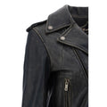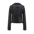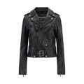 Calfskin Jacket by Golden Goose, asymmetrical front zipper closure, classic lapels with metallic buttons, slanted welt pocket on front, two side welt pockets, waistband with metallic buckle, patch pocket on front with snap button for closure, zipper on cuffs, tone-on-tone stitching.