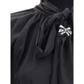 The Leonida silk Blouse features a loose, flowing fit with batwing raglan sleeves that add lightness to the design. The V-neckline is enhanced by a bow-tie scarf collar, while the high cuffs feature an elegant covered side button. At the back, a center-cut pattern and a longer asymmetrical hem complete the garment, which is embellished with a removable metal jewel loop.