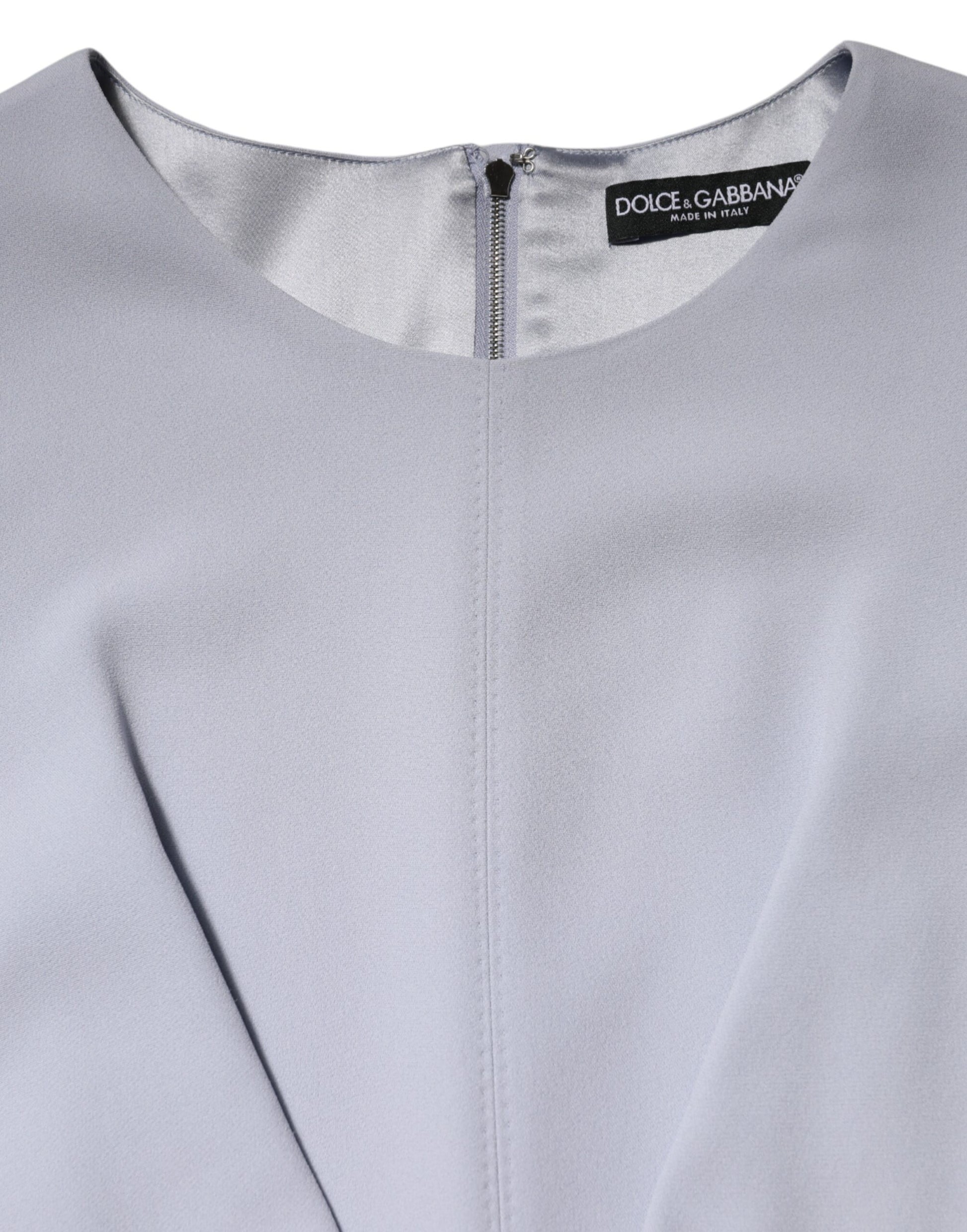 Gorgeous brand new with tags, 100% Authentic Dolce & Gabbana light blue midi dress. This elegant dress features short sleeves, a round neckline, and a statement floral applique at the waist. Designed in a soft viscose blend with silk lining for a refined finish. Perfect for formal occasions or special events.