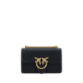Calfskin Love One Mini Shoulder Bag by Pinko, featuring front flap closure with magnetic button, iconic gold-plated Love Birds logo embossed on front, dual interior compartment, sliding chain strap, iconic tone-on-tone embroidered brand monogram on back, adjustable and removable flat leather shoulder strap.