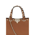 The Mini Shopping Rockstud by Valentino Garavani is crafted from grained calfskin and can be worn on the shoulder, cross-body, or carried by hand thanks to its handles and removable chain. It is adorned with studs and metal parts in a platinum finish and features a hook closure. The nappa lining and interior with two card slots complete this versatile and refined bag.