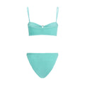 The Misty Swimsuit by Hunza G is ideal for those seeking a sophisticated and modern look. The bikini model is composed of low-waisted bottoms and a top with thin straps, enriched by a cut-out detail with a ring on the front, which adds a touch of distinctive style. The exclusive Original Crinkle workmanship allows the fabric to stretch to flex, sculpt and support every curve, adapting perfectly to all body types, ensuring a unique fit.