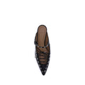 Ganni’s Oleatex laced Mules are inspired by the lace-up boots of the 1920s, combining nostalgia and contemporary appeal. Made of crinkled Oleatex Fabrics of the Future, they feature metal eyelets, waxed crisscross laces, a long tapered toe, and an iconic mini heel with a GANNI butterfly logo and chrome finish for a distinctive, modern touch.