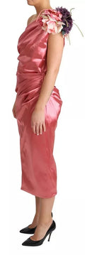 Gorgeous brand new with tags, 100% Authentic Dolce & Gabbana Draped midi dress with pink appliqués. Featuring a one-shoulder neckline, an embossed textile flower detail on the shoulder, a draped effect, a side zip fastening, a below-the-knee length, a satin effect and a fitted shape.