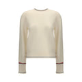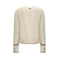 Thom Browne’s pointelle wool Sweater combines fine workmanship with the brand’s iconic details. Crafted from soft wool with perforated pointelle work, it features a ribbed crew neck, cuffs and hem that define the fit. The iconic tricolor bands on the sleeves add a distinctive touch, while the striped-finish buttons on the hem and cuffs recall the house’s unmistakable aesthetic. An elegant and recognizable garment, ideal for curated looks with a contemporary taste.