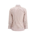 The Layered Tulle Striped Shirt by Maison Margiela embodies conceptual elegance and refined craftsmanship. Made from white striped cotton and fully overlaid with sheer, form-fitting tulle, it showcases the Maison’s signature play on texture and structure. Gathered long sleeves, a sculpted hem, and a pointed collar create a distinctive silhouette, while the iconic Four Stitches at the back mark its authenticity. Finished with a front button closure, this shirt blends classic tailoring with avant-garde sophistication.