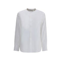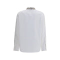 Alexander McQueen’s cotton Shirt is distinguished by a delicate raised collar embellished with transparent, silver-tone crystals that add a refined touch. The clean lines are complemented by a classic row of white buttons and long, defined cuffs, which enhance the minimalist style and make the garment extremely versatile.