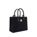 Cotton Shoulder Bag by Versace, rigid leather top handles, removable flat shoulder strap, top button closure, single interior compartment, iconic brand monogram embossed on front, leather feet at base, iconic Medusa embossed applique on front.