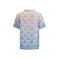 Gradient Heart short-sleeved silk twill shirt printed with multicolored degradé heart monogram, Cuban collar, breast pocket, and striped details on collar, cuffs, hem, and flap.